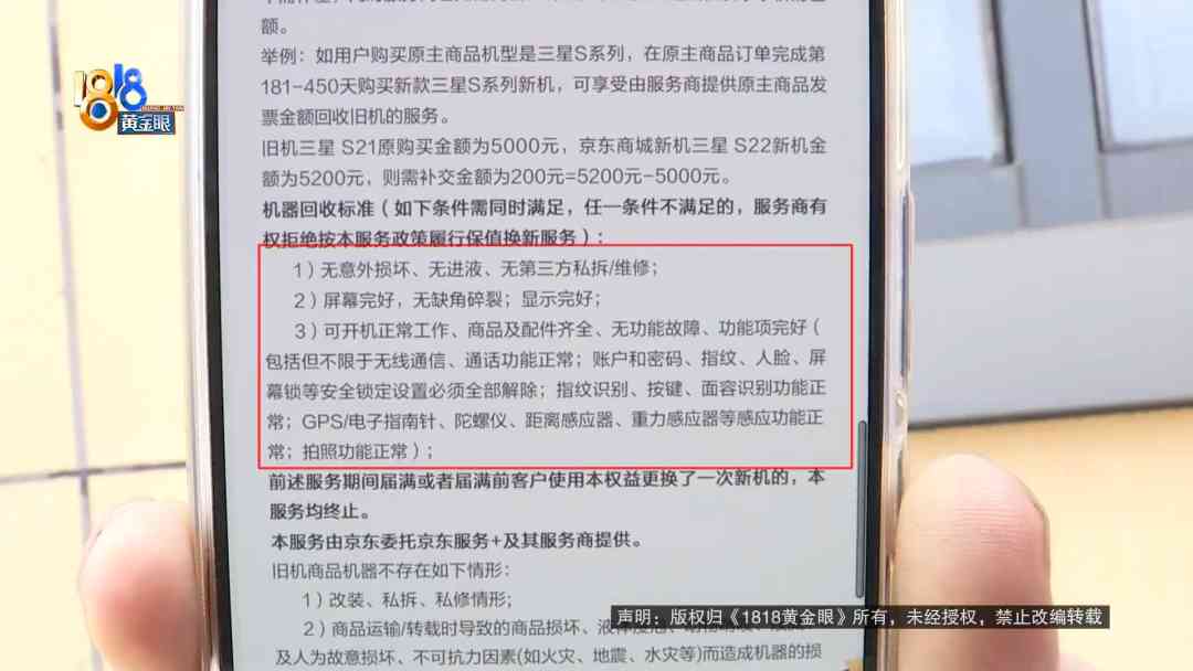 魏師傅這部手機,是在去年2月11日下單的,他說原價4999元,當時還加50元購買了“京東服務+” 的保值換新服務,所以組合支付了5049元。記者注意到,這項服務由“京東服務+”及其服務商提供,約定滿一年可享受換新機服務,還規(guī)定了舊機回收標準:1、無意外損壞,無進液、無第三方私拆或維修;2、屏幕完好,無缺角碎裂,顯示完好;3、可開機正常工作,商品及配件齊全,無功能障礙等。