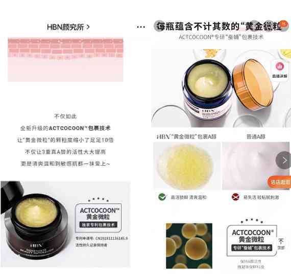 另?yè)?jù)財(cái)經(jīng)網(wǎng)產(chǎn)經(jīng)對(duì)比,HBN不僅修改了官網(wǎng)的專利頁(yè)面。在ACTCOCOON黃金微粒的形容中,將原先公眾號(hào)推文中的“專利包裹技術(shù)”一詞,在電商頁(yè)面改為“專研‘蠶蛹’包裹技術(shù)”。原先展示的“活性持久記錄保持者”措辭以及相關(guān)可追溯至申請(qǐng)人廣東芭薇的“微凝珠抗衰精華液”專利號(hào)也被隱去。