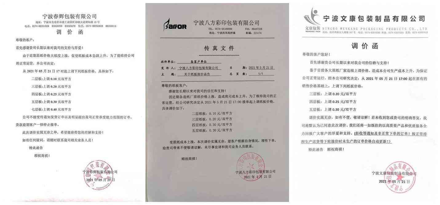 5月21日,就在各大紙廠宣布漲價后,寧波市十多家知名紙板廠宣布漲價,涵蓋各類紙板規(guī)格。 例如,寧波春輝包裝有限公司、八方彩印包裝有限公司、文康包裝制品有限公司等,紛紛上調一-七層板0.1-0.4元/雙平方。