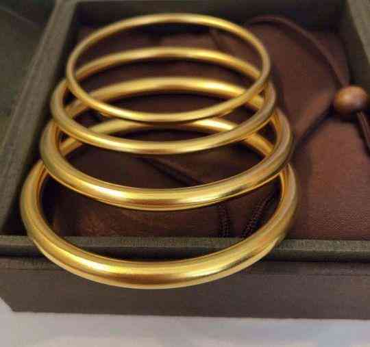 古法黃金,古法這兩個字不是虛的,顧名思義,就是用古代的方法,得和現(xiàn)代工藝區(qū)別開來。一得有點真東西,的確是古法傳承;二還得有點好東西,得是古法做的比現(xiàn)代工藝好。所以優(yōu)點是,運用非物質(zhì)文化古老的鑄金工藝,純手工打造,文理平整均勻,古色古香,每一件產(chǎn)品都是精雕細琢。工藝精湛,美輪美奐。中國精美絕倫的古代八大金工藝:花絲鑲嵌、鎏金、掐絲、錘揲、鏨花、金銀錯、炸珠、累絲。大多是啞光,很難留下指紋和劃痕。缺點是工藝非常厚實,一般大小一樣的黃金手鐲,古法金要比普通金克重占比大三分之二。