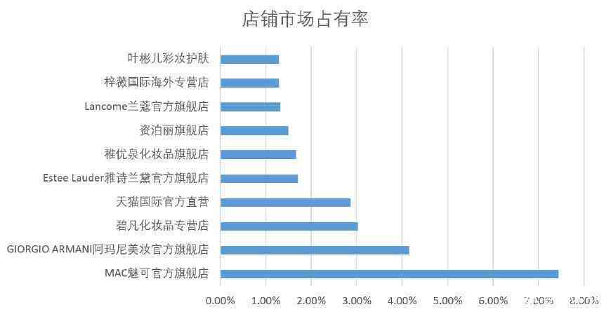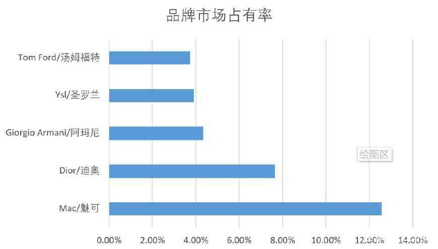 Mac/魅可、Dior/迪奧、Giorgio Armani/阿瑪尼、Ysl/圣羅蘭、Tom Ford/湯姆福特的市場占有率分比為:12.57%、7.64%、4.34%、3.91%、3.74%。其中人氣最高的是品牌Mac/魅可。高達17萬。