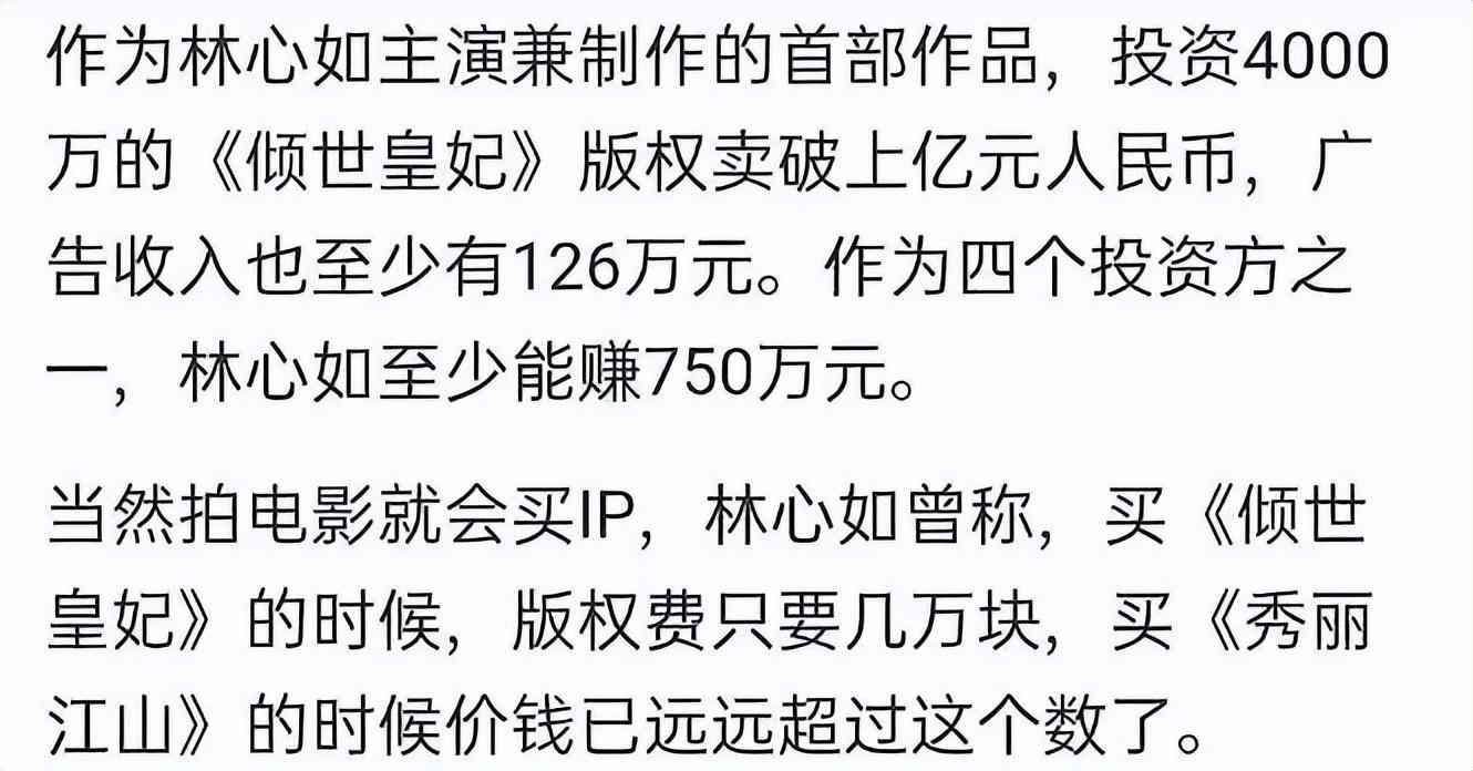 嘗到甜頭的林心如信心大增,開(kāi)始以制作人的身份頻繁出手投資影視劇。