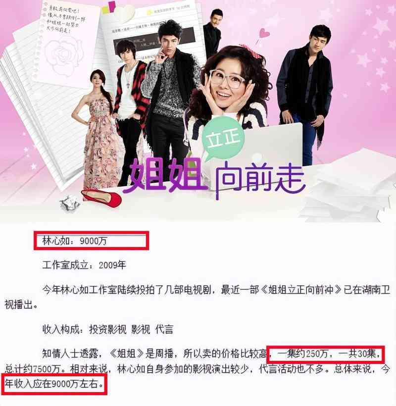 其中由她投資并主演的電視劇《姐姐立正向前走》,直接賣出了7500萬(wàn)的天價(jià),林心如也憑此賺翻了,單單是2012年一年,她的收入就達(dá)到了驚人的九千萬(wàn)。