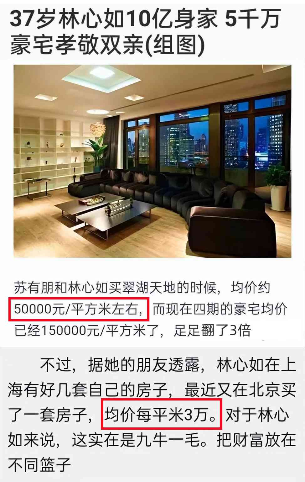 當(dāng)年林心如在爆紅后做的件事就是幫父母在臺(tái)灣買房子,后來(lái)因?yàn)殚L(zhǎng)期在內(nèi)地拍戲,她又相繼在北京、上海購(gòu)入豪宅。