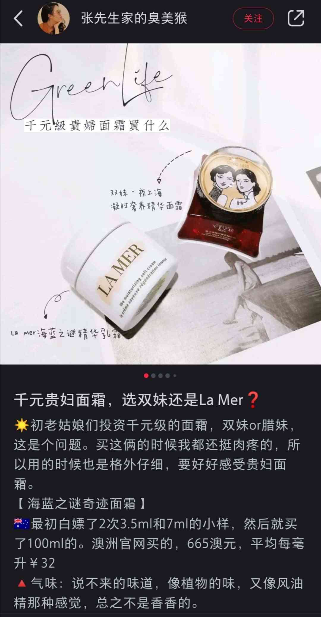 現(xiàn)在雙妹的主要銷售陣地之一是天貓旗艦店,據(jù)店鋪信息顯示,2013年便已開店,目前有近40萬粉絲。界面時尚在商品評論中看到,消費者對產(chǎn)品的評價整體較好。在小紅書上,也有一些用戶會主動分享雙妹的產(chǎn)品,被稱作“爆冷門”品牌,甚至還有用戶將它和法國奢侈護膚品牌La Mer作比較。