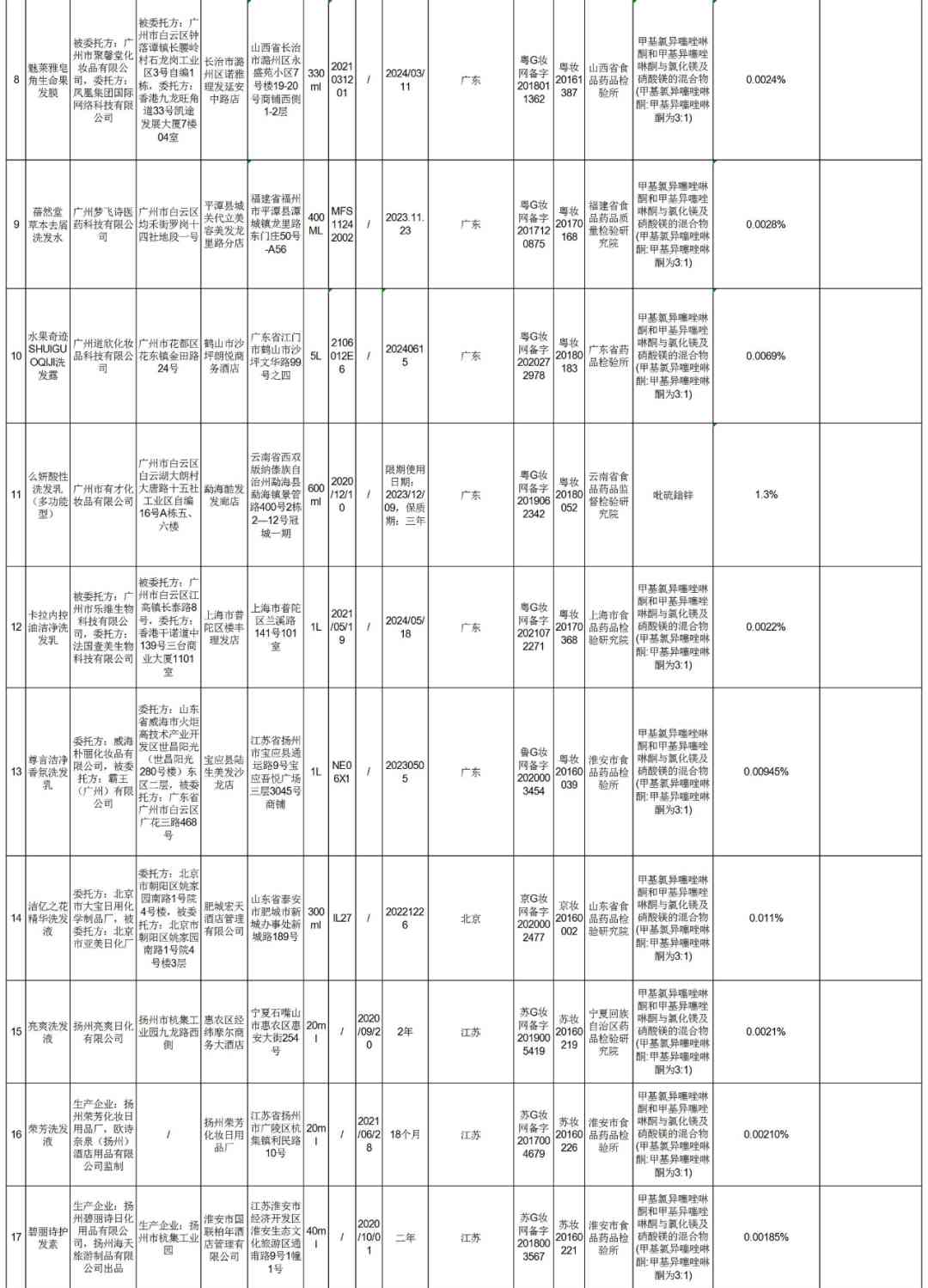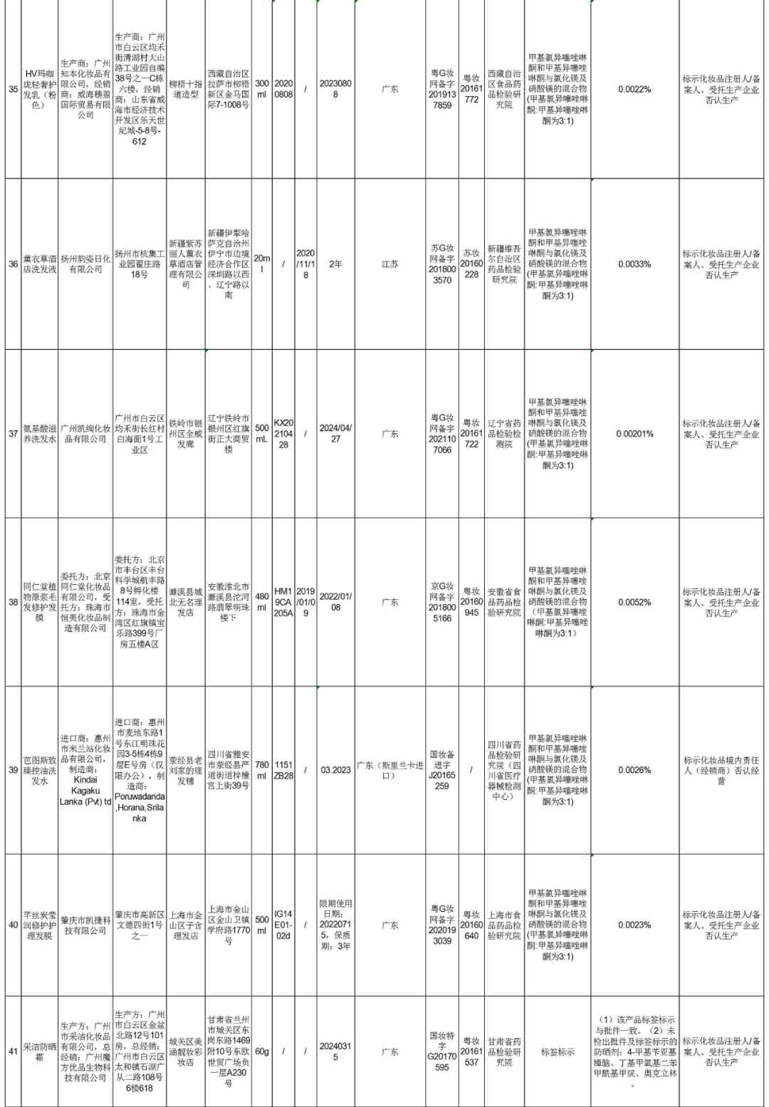 在通告中,同仁堂一批次“植物原漿毛發(fā)修護(hù)發(fā)膜”被檢出甲基氯異噻唑啉酮和甲基異噻唑啉酮與氯化鎂及硝酸鎂的混合物超標(biāo)。另有多款不同品牌的洗發(fā)水洗發(fā)液、發(fā)膜發(fā)乳也存在這一問題。如:兩面針的途悅洗發(fā)露、Simply詩柏路無硅油生姜洗發(fā)液、巴緹仕膠原蛋白發(fā)膜、VISIONAL威爾仕洗發(fā)水、華雅洗發(fā)液、卡拉內(nèi)控油潔凈洗發(fā)乳等。