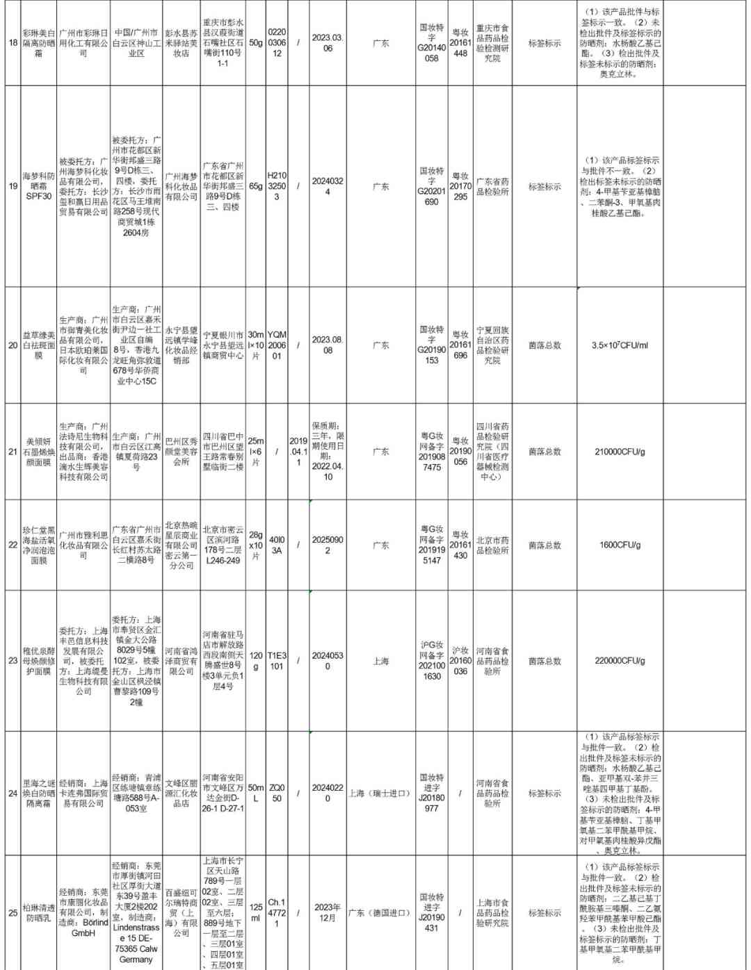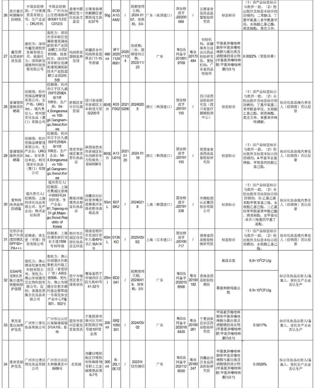 從通告可以看到,此次不符合規(guī)定的化妝品主要包括洗護(hù)發(fā)、面膜、防曬、精華、潤膚等品類,涉及的品牌有哈羅閃、安熱沙、里海之謎、同仁堂、愛和純、PYC等知名品牌。其中洗發(fā)護(hù)發(fā)類產(chǎn)品最多,總共高達(dá)27批次,其次則是防曬產(chǎn)品12批次。上“黑榜”的產(chǎn)品中不乏稚優(yōu)泉酵母煥顏修護(hù)面膜、安熱沙水能戶外清透防曬乳SPF50+·PA+++、同仁堂植物原漿毛發(fā)修護(hù)發(fā)膜等知名品牌。