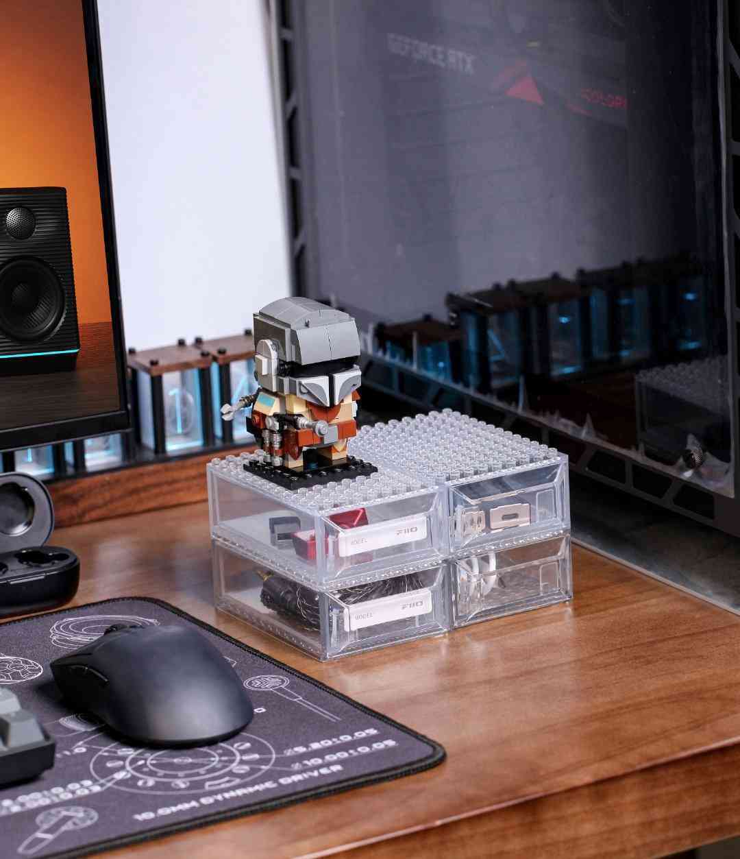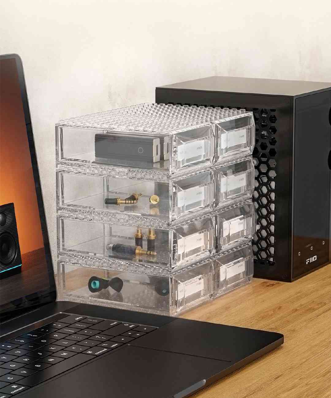 HB11 的內(nèi)部空間約為 101x60x27mm,上下兩側(cè)配有類似樂高積木的凹凸圓孔,用戶可以將多個收納盒自由組合拼接,并從前方的抽屜中拿取物品。