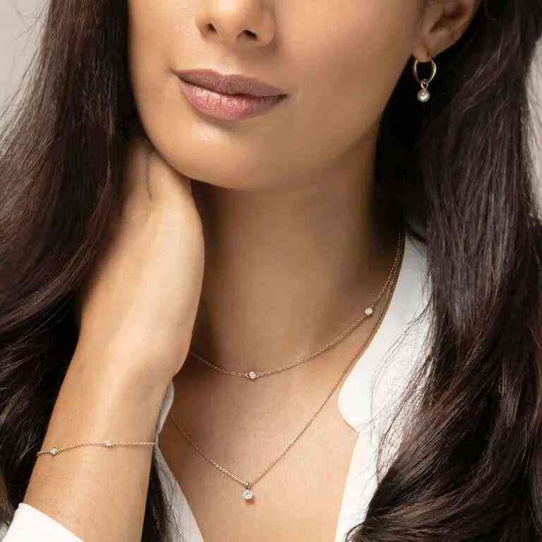 有點(diǎn)兒意外?是的, 30 分鉆石真的要靠設(shè)計(jì)才能吸睛,首先是形狀的對(duì)比,戴兩顆耳釘也不如簡單鑲嵌的項(xiàng)鏈明顯,因?yàn)榫€和點(diǎn)的組合就比分隔的單獨(dú)一個(gè)點(diǎn)更引人注意。