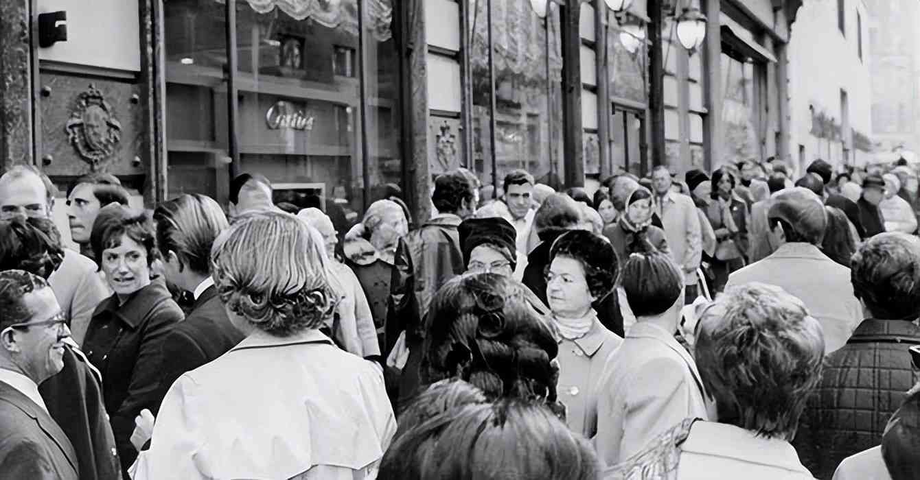 1969 年,人們?cè)诳ǖ貋喌谖宕蟮赖赇伹芭抨?duì)觀看泰勒·伯頓鉆石