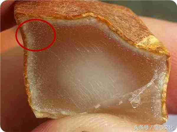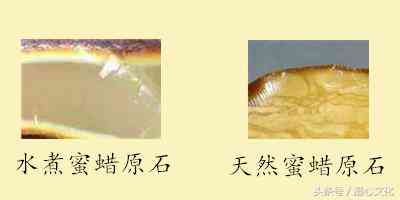 由上圖可見,左側(cè)水煮蜜蠟原石的橫截面中出現(xiàn)了兩個(gè)分層:原皮層、氧化層,而右邊的天然蜜蠟原石僅能看見原皮層。