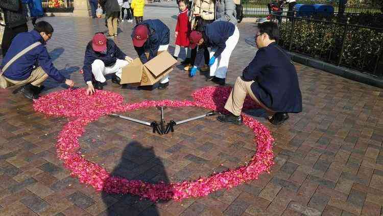 正好看到工作人員在鋪灑玫瑰花瓣,那些新鮮的花瓣似乎還含著朝露。它們被小心地造型成米奇頭的圖案,給節(jié)日中的樂園平添了幾分浪漫。