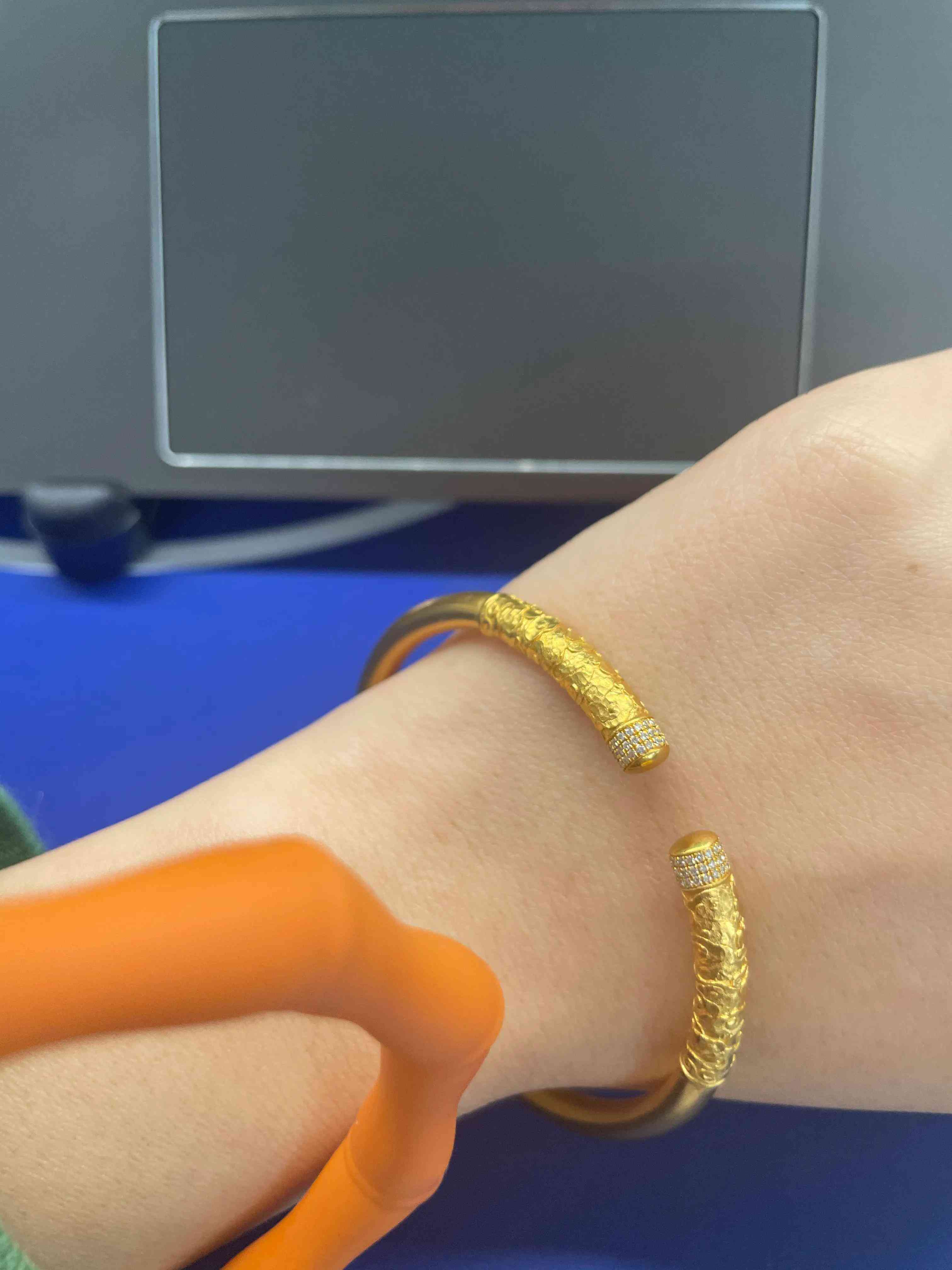其次,當(dāng)今市場對古法金的認(rèn)同感最高。佩戴首飾,本身就是為了悅己和獲得身份認(rèn)同。古法金飾這些年帶動了90后甚至00后對黃金的消費(fèi)熱情,佩戴古法金不但不土氣,還很時髦,當(dāng)然令主人開心了。此外,金飾最怕頻繁摘取中遺失,因此很多人的手鐲 項鏈 戒指長期不摘的,古法金由于克重較大,厚壁或者實心居多,即使長時間佩戴也不容易變形。當(dāng)然,我也見過很多人提到古法金鐲戴久了之后磨砂感減弱,甚至有了劃痕。這個我認(rèn)為屬于歲月的痕跡,無可避免,也不用太在意??偙任夷切┎噬珜毷氖罪?,到家就摘,定期涂嬰兒油保養(yǎng)方便吧。