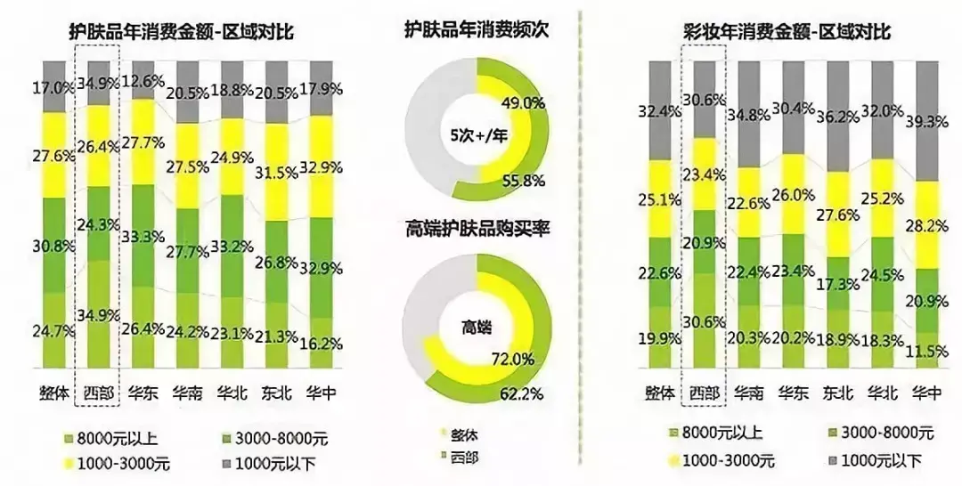 這組數(shù)據(jù)來自于艾瑞咨詢,從圖表中可以看出,三成以上的西部地區(qū)消費者年消費金額超過8000元,而從全國各個區(qū)域來看,1000元以下這個區(qū)間的普遍比較少,除了西部地區(qū)。說明,中國女性在美妝產(chǎn)品上的消費金額還是比較高的。
