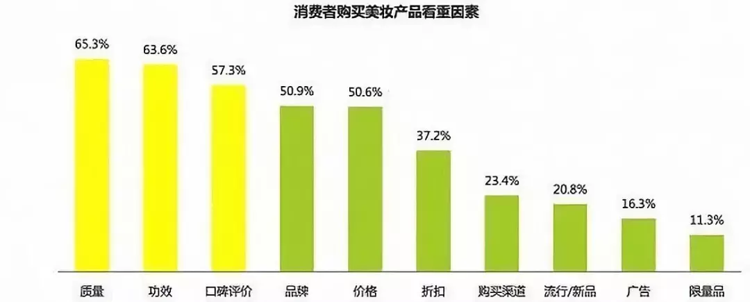 數(shù)據(jù)顯示,質(zhì)量、功效、口碑評價時消費者購買美妝產(chǎn)品是最為看重的因素,而流行、廣告等則排在末位,這也正是品牌長久的生存之計。