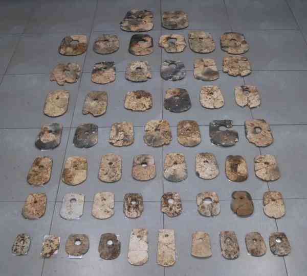 石器以鉞占絕對(duì)多數(shù),拼合后完整石鉞60余件,另有少量錛。這些石鉞多為寬扁形,大孔、三邊刃,并有少量雙孔石鉞。其中一件長(zhǎng)38.3厘米,上寬24.3、下寬28.5厘米,為凌家灘目前發(fā)現(xiàn)的體量最大的石鉞,也是中國(guó)新石器時(shí)代最大的石鉞。