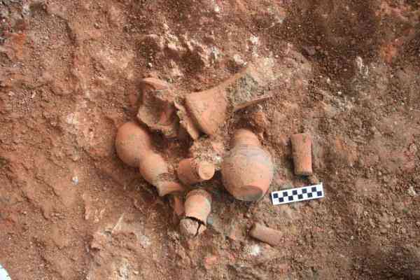 祭祀坑底部是一個(gè)紅燒土坑,祭祀坑和紅燒土坑的西側(cè)外圍是一處石頭遺跡,整體呈半環(huán)形環(huán)繞著祭祀坑,一直向西延伸到崗地西側(cè)的平地,呈長(zhǎng)條形分布,可能為通往墓葬祭祀?yún)^(qū)的道路??脊艑W(xué)家認(rèn)為,整個(gè)崗地中部區(qū)域都是事先有著統(tǒng)一規(guī)劃的墓葬祭祀場(chǎng)所,其營(yíng)建使用程序是:首先在墓地的西側(cè)斜坡處鋪墊大量的石子層,并壘砌出一個(gè)圓角方形的坑,坑內(nèi)填大量紅燒土塊,在其上部再進(jìn)行祭祀,祭祀時(shí)堆放了大量的玉石器和陶器,再進(jìn)行高溫焚燒。