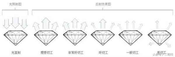 為什么把切工放在最后來講呢?因為在4C標(biāo)準(zhǔn)中,最重要的是切工。好的切工應(yīng)盡可能的體現(xiàn)鉆石的亮度和火彩,并且盡量保持原石重量。鉆石就是利用折射讓它看起來更閃,鉆石每個面之間的夾角很重要,如果切碎了鉆石就不閃了。IGI國際寶石學(xué)院的切工等級從高到低分為 EX(優(yōu))、VG(很好)G(好)、ID(標(biāo)準(zhǔn)),中國國檢分為:VG (很好)、G(好)。最好的就是EX,其實VG以上的鉆石就已經(jīng)很好啦~
