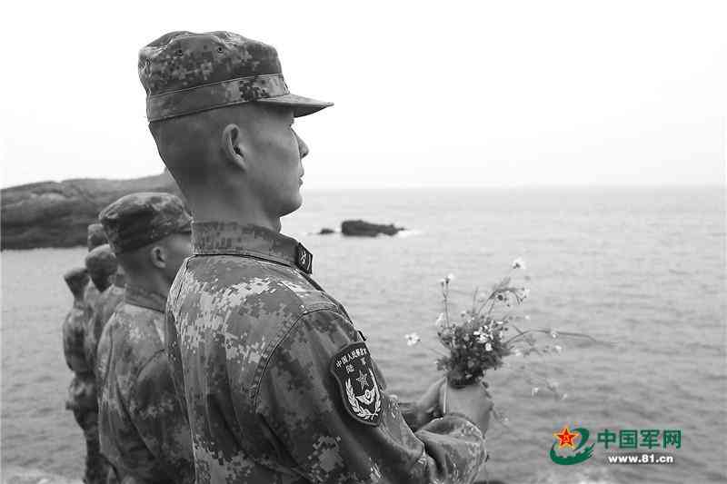 將山花撒入海中,連隊(duì)官兵祭奠蘭桂森烈士。