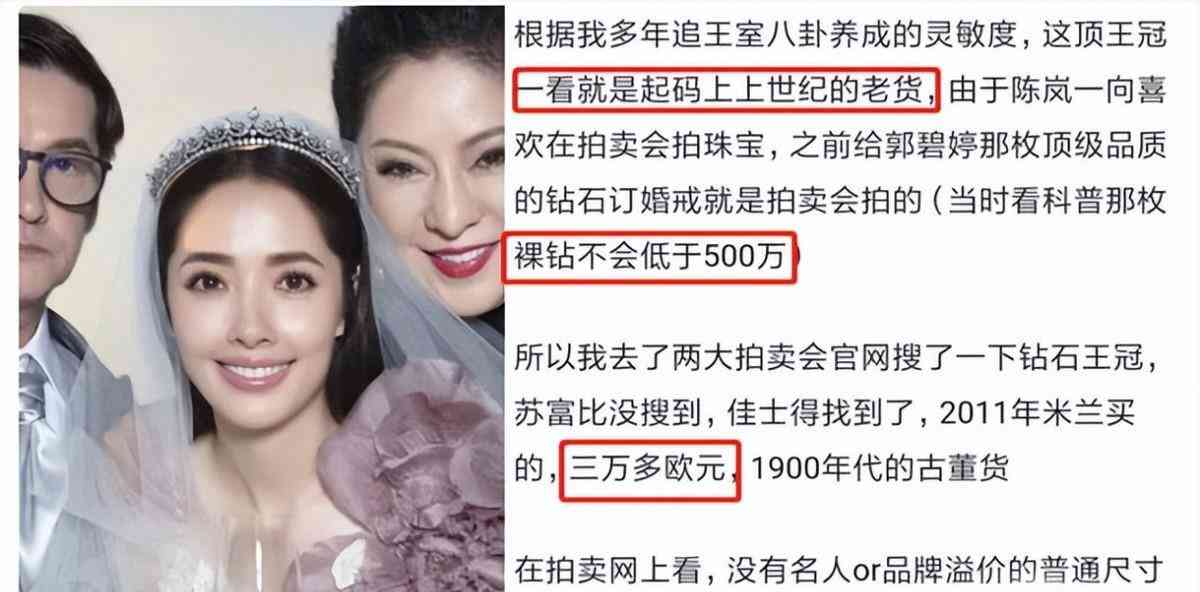 而在婚禮上,郭碧婷戴的皇冠也是大有來頭。據(jù)說這個(gè)皇冠是向太在8年前拍下來的,起拍價(jià)就高達(dá)三萬多歐元,還是1900年代的古董貨。珍藏了8年,只為留給未來的兒媳婦。