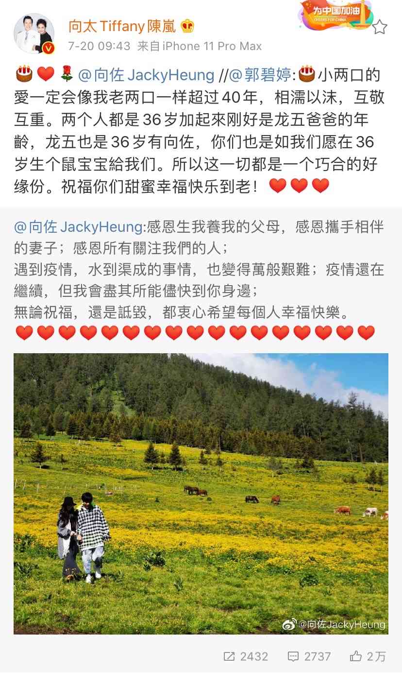 向佐36歲生日時(shí),發(fā)微博感慨發(fā)文。隨后郭碧婷轉(zhuǎn)發(fā)了并附上一個(gè)“蛋糕”表情。本來只是風(fēng)平浪靜,但向太卻轉(zhuǎn)發(fā)兒媳微博直接爆出郭碧婷已經(jīng)如他們愿懷孕。
