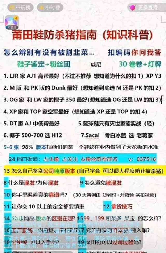 為了普及“高品質(zhì)假鞋”,假鞋商們還開拓延伸業(yè)務(wù),在抖音直播間進(jìn)行網(wǎng)課教學(xué),手把手教用戶怎么判斷假鞋的品質(zhì)與細(xì)節(jié),拿貨“三要”“三不要”,怎么避免被混發(fā),該選擇哪家工廠的哪款鞋等等。 在直播間屏幕上,他們會(huì)打上“莆田鞋防殺豬指南”幾個(gè)大字,美其名曰“為了你們好”。