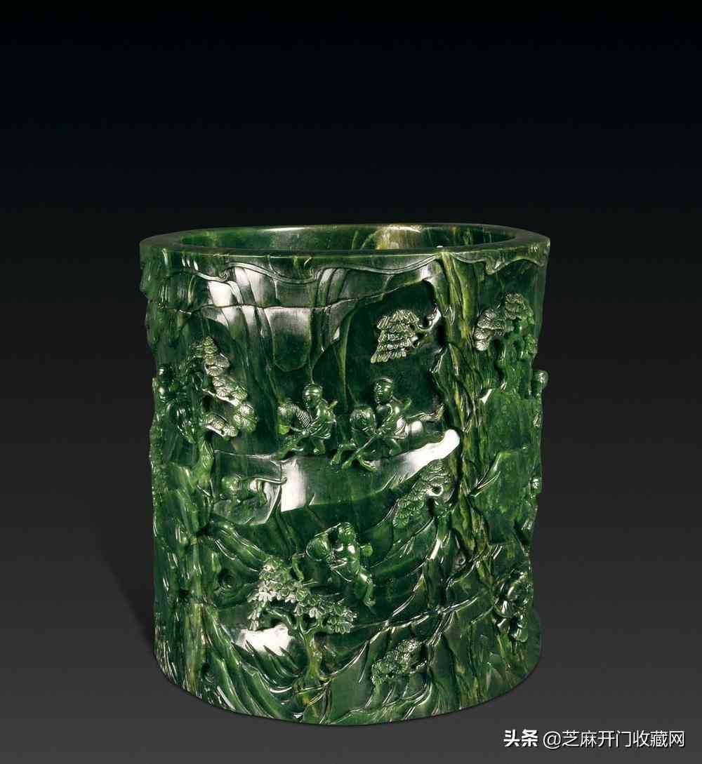 清乾隆碧玉山水狩獵圖筆筒,尺寸:高21厘米,估價(jià):RMB 1,200,000 ~ 1,800,000,成交價(jià): RMB 2,240,000
