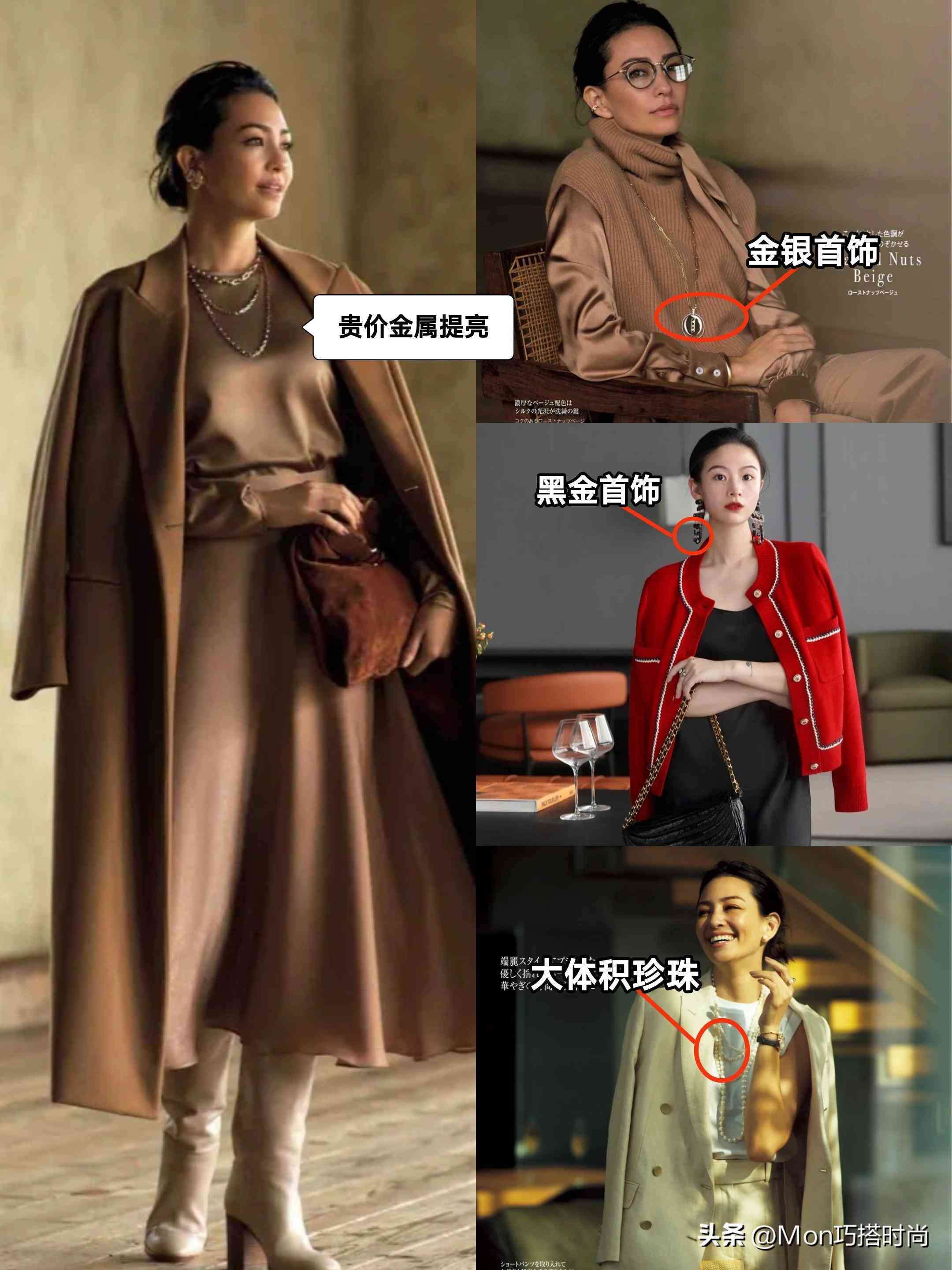 也不能光把貴氣感全部交給服裝的色彩,配飾也可以成為點(diǎn)睛之筆。在以貴氣色為主的搭配中,可用金銀、珍珠等首飾點(diǎn)綴。