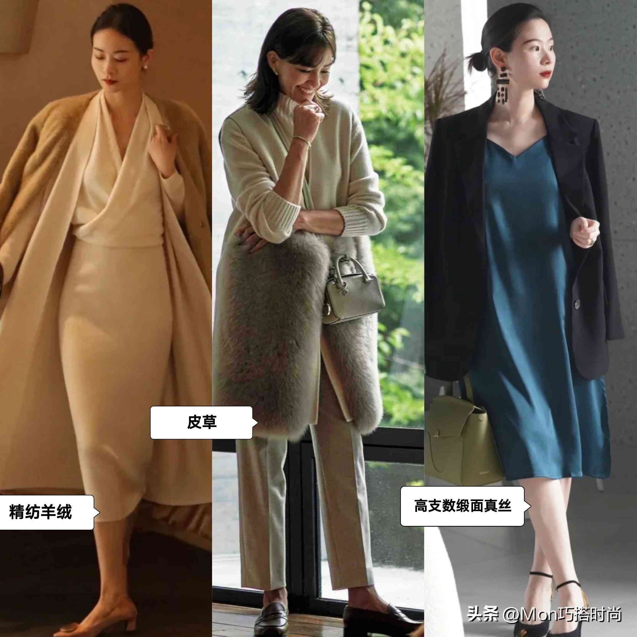 精紡羊絨、皮草、高支數(shù)緞面真絲等質(zhì)地奢華高雅,加上貴婦色,版型越簡單越有氣質(zhì)。