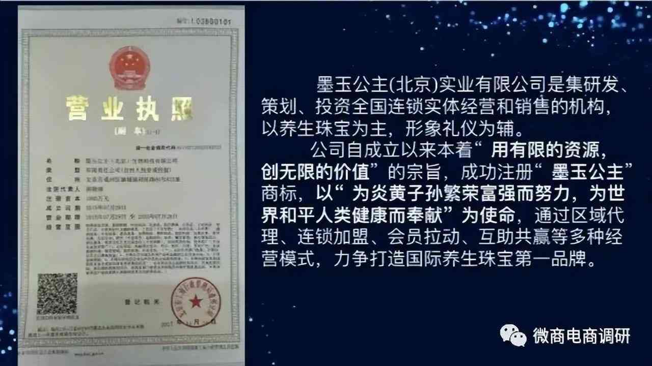 據(jù)宣傳資料,墨玉公主(北京)生物技術(shù)有限公司是一家集研發(fā)、生產(chǎn)、銷售、投資全國(guó)品牌連鎖實(shí)體店的機(jī)構(gòu),在北京、蘇州、商丘等地成立連鎖機(jī)構(gòu)品牌及高端珠寶商務(wù)會(huì)所。以養(yǎng)生珠寶為根本,國(guó)學(xué)易理文化為推動(dòng),布局大健康產(chǎn)業(yè)、電商平臺(tái)、品牌餐飲連鎖、文化旅游小鎮(zhèn)等。
