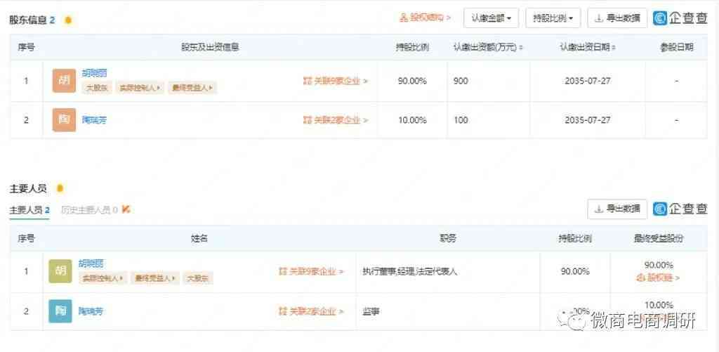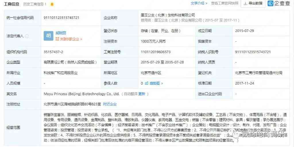 企查查APP顯示,墨玉公主(北京)生物科技有限公司成立于2015年7月29日,注冊(cè)地位于北京市通州區(qū)潞城鎮(zhèn)胡郎路80號(hào)823室,注冊(cè)資本為1000萬(wàn)元,實(shí)繳資本為0,法定代表人為胡曉麗。該公司由胡曉麗控股90%并擔(dān)任執(zhí)行董事兼總經(jīng)理,陶瑞芳持股10%并擔(dān)任監(jiān)事。胡曉麗是該公司的實(shí)際控制人和最終受益人,同時(shí)也是墨玉公主的創(chuàng)始人。