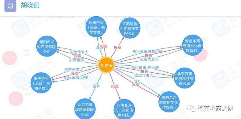 根據(jù)企查查可知,胡曉麗共和9家企業(yè)有關(guān)聯(lián),她不僅是墨玉公主(北京)生物科技有限公司的董事長(zhǎng),還對(duì)外投資了河南華胥易道文化傳媒有限公司,控股90%并擔(dān)任法定代表人、執(zhí)行董事兼總經(jīng)理;投資了北京百事創(chuàng)捷科技有限公司,控股100%并擔(dān)任法定代表人、執(zhí)行董事兼總經(jīng)理;投資了河南禮易天下文化傳媒有限公司,持股49%;投資了江蘇智信生物科技有限公司,控股51%;投資了濮陽(yáng)市龍悅商貿(mào)有限公司,控股100%并擔(dān)任法定代表人和執(zhí)行董事;投資了濮陽(yáng)龍之韻影視文化傳媒有限公司,控股70%;投資了鈺唐中天(北京)餐飲管理有限公司,持股50%并擔(dān)任監(jiān)事;還在北京龍泉潤(rùn)商貿(mào)有限公司任職監(jiān)事。