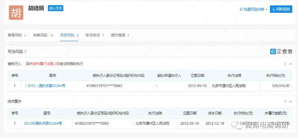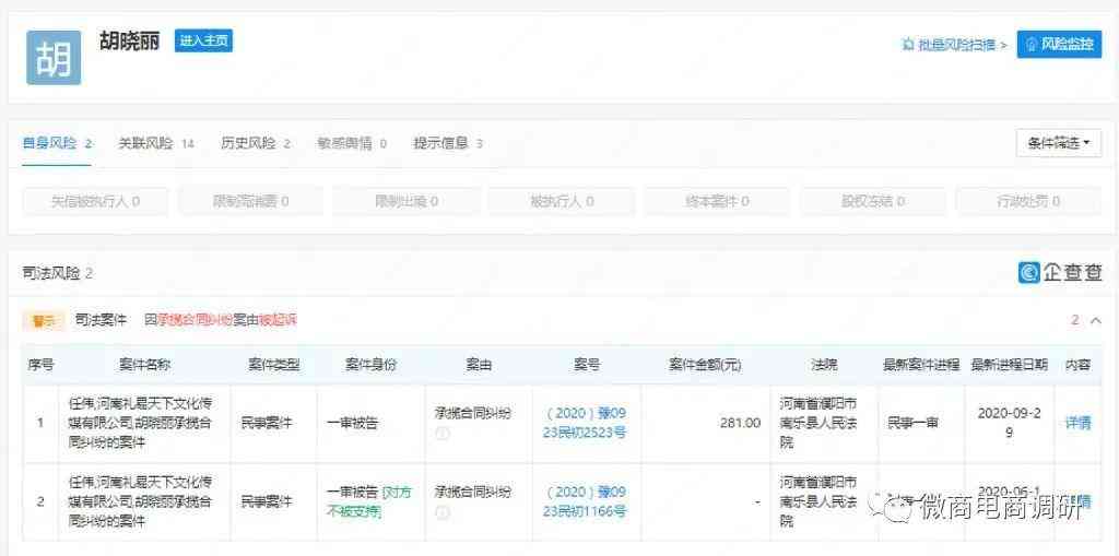 但值得注意的是,河南禮易天下文化傳媒有限公司、江蘇智信生物科技有限公司、濮陽(yáng)市龍悅商貿(mào)有限公司和濮陽(yáng)龍之韻影視文化傳媒有限公司都已是注銷狀態(tài),鈺唐中天(北京)餐飲管理有限公司和北京龍泉潤(rùn)商貿(mào)有限公司也都已被吊銷。胡曉麗本人涉及一起終本案件,還因承攬合同糾紛案由被起訴2次,因未按時(shí)履行法律義務(wù)被法院強(qiáng)制執(zhí)行1次。