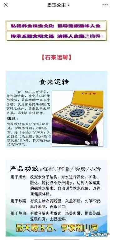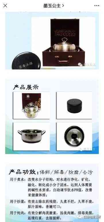 據(jù)宣傳,墨玉保健鍋、墨玉“食來運(yùn)轉(zhuǎn)”產(chǎn)品有保鮮、解毒、防腐、去污的功效,用于煮水可以改變水分子結(jié)構(gòu),對(duì)水進(jìn)行凈化、礦化、磁化、轉(zhuǎn)化成小分子團(tuán)水,達(dá)到人體需要的堿性水要求,自動(dòng)調(diào)節(jié)飲水PH值,改善亞健康體質(zhì);用于炒菜可以有效去除農(nóng)藥殘留,久煮不爛,久翠不衰,原汁原味,香嫩可口;用于燉肉可以有效分解肉類激素,湯美肉嫩,排毒美顏,返璞歸真,去腥提鮮。