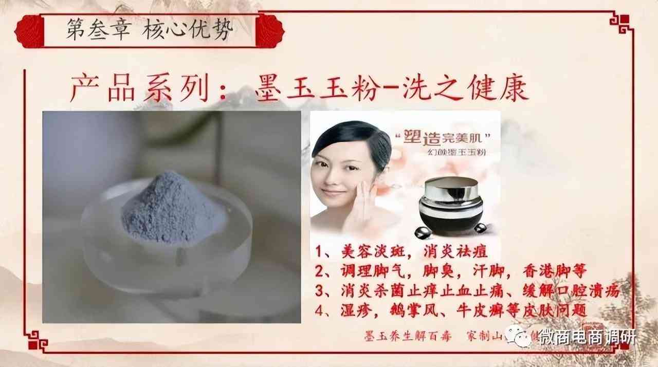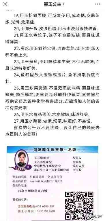 據(jù)墨玉公主公眾號(hào)宣傳,李時(shí)珍的《本草綱目》里記載:“玉屑、甘平、無毒,主治胃中熱,喘息煩滿,止渴,屑如麻豆服之,久服輕身長(zhǎng)年。潤(rùn)心肺,肋聲喉,滋毛發(fā),滋養(yǎng)五臟,止煩躁?!薄坝窬陡省⑵?、無毒,久服神水令人體潤(rùn),毛發(fā)不白” 。胡曉麗認(rèn)為墨綠玉石是蓄元?dú)?,養(yǎng)精神的物質(zhì),不但有磁化功能,還有強(qiáng)大的解毒功能;不但有其他玉所具備的共性,還有其本身的獨(dú)特性,是帶功能的玉種。墨玉公主品牌擁有墨玉系列養(yǎng)生珠寶、墨綠玉粉、玉石保健鍋等各種墨玉制作的產(chǎn)品,各自有著不同功效。