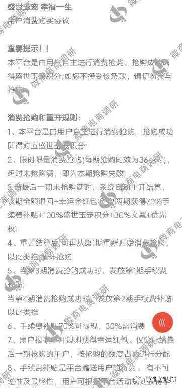 參與認(rèn)購(gòu)需要自己往賬戶余額充值,才可以參與搶購(gòu),搶購(gòu)金額在100~3000元之間,每期的搶購(gòu)時(shí)效為36小時(shí),七天為一周期。第八天返還認(rèn)購(gòu)金額+10%的手續(xù)費(fèi),其中70%可以提現(xiàn),30%為消費(fèi)積分,用于積分商城兌換商品。第3期認(rèn)購(gòu)結(jié)束后發(fā)放第1期的獎(jiǎng)勵(lì),第4期認(rèn)購(gòu)結(jié)束發(fā)放第2期的獎(jiǎng)勵(lì),以此類推。當(dāng)最后一期未搶購(gòu)滿時(shí),系統(tǒng)自動(dòng)重開結(jié)算,該期全額退回,還可以獲得幸運(yùn)金紅包,倒數(shù)兩期獲得70%手續(xù)費(fèi)補(bǔ)貼+100%盛世玉寵積分+30%文票+優(yōu)先權(quán),重開結(jié)算后,可再?gòu)牡?期重新開始消費(fèi)搶購(gòu),循環(huán)搶購(gòu)。