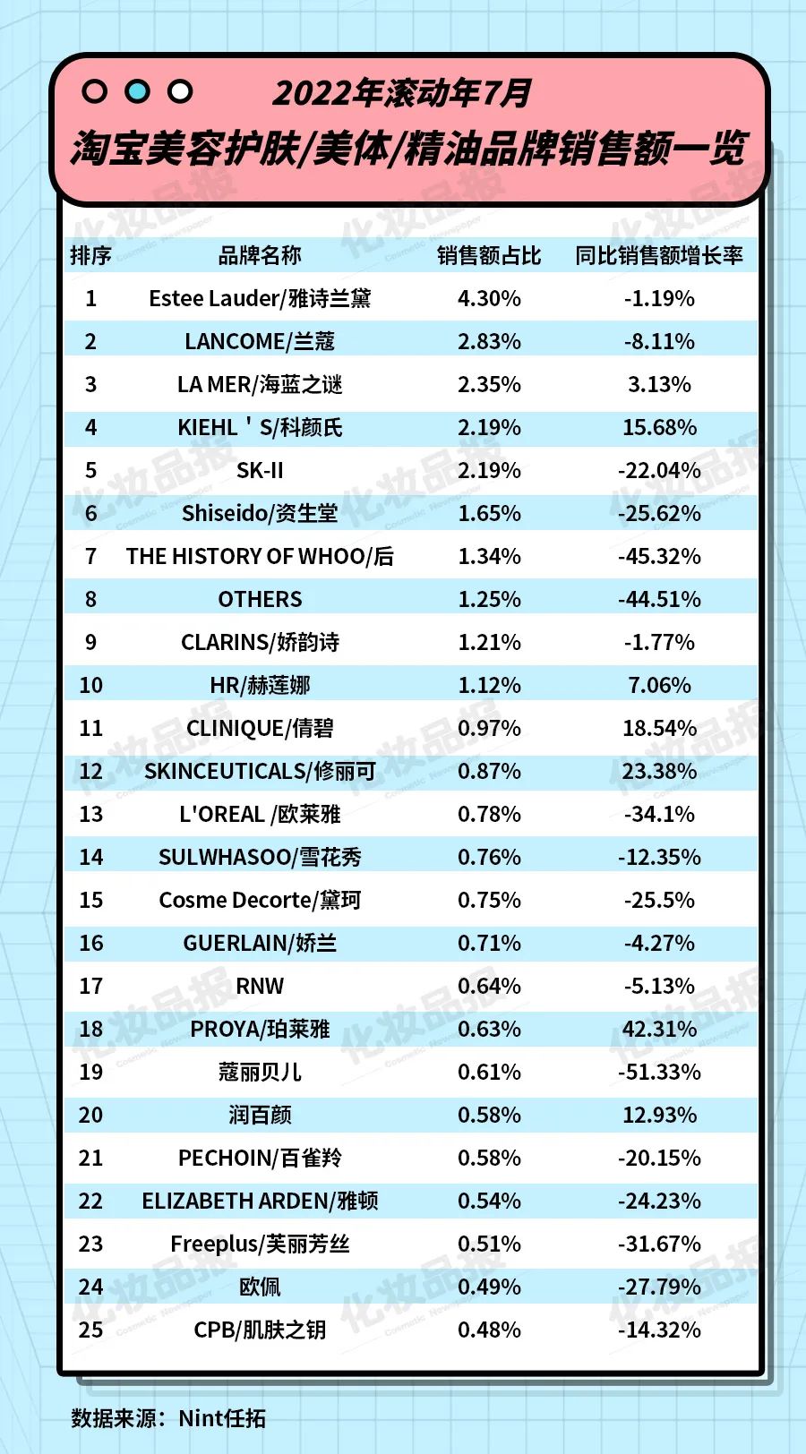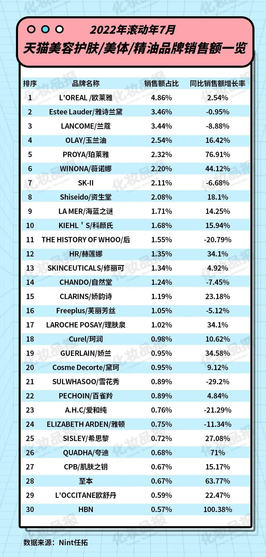 從品牌來看,2021年8月-2022年7月,TOP25護(hù)膚品牌和TOP25彩妝/香水品牌中,超70%品牌銷售額出現(xiàn)下滑。其中,雅詩蘭黛、蘭蔻、資生堂、后等外資品牌雖然位居前列,但銷售額均呈現(xiàn)下滑態(tài)勢。
