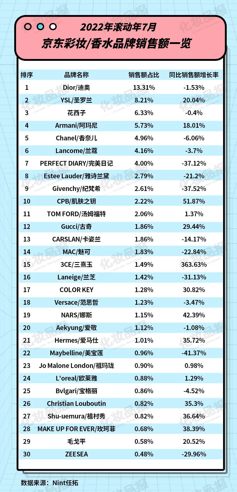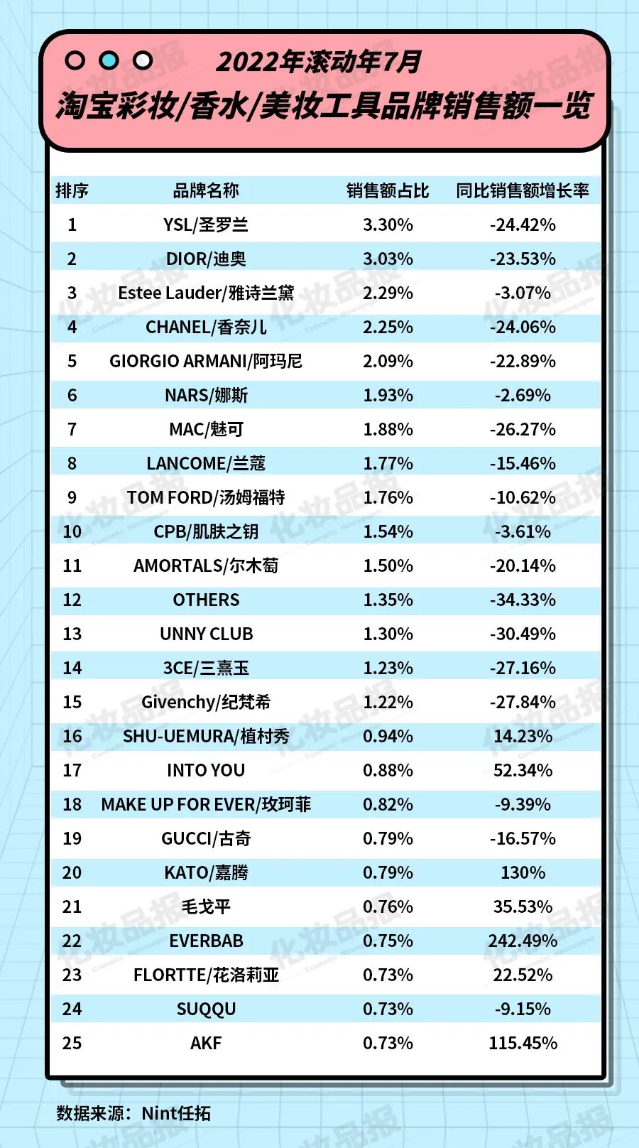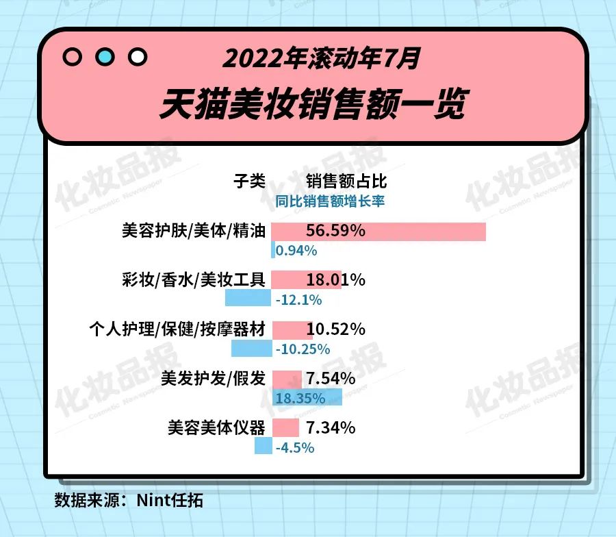 導(dǎo)讀: 線上化妝品銷售的艱難時(shí)刻。文丨夏濤 肖紅Nint任拓?cái)?shù)據(jù)顯示,2022年滾動(dòng)年7月(2021年8月-2022年7月),線...