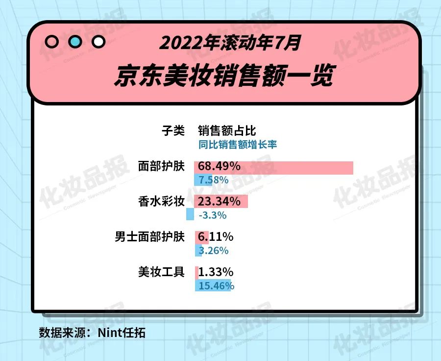 過去一年,京東美妝與同期相比趨于穩(wěn)定,面部護(hù)膚、男士面部護(hù)膚、美妝工具等品類平穩(wěn)增長,香水彩妝品類下降3.3%。