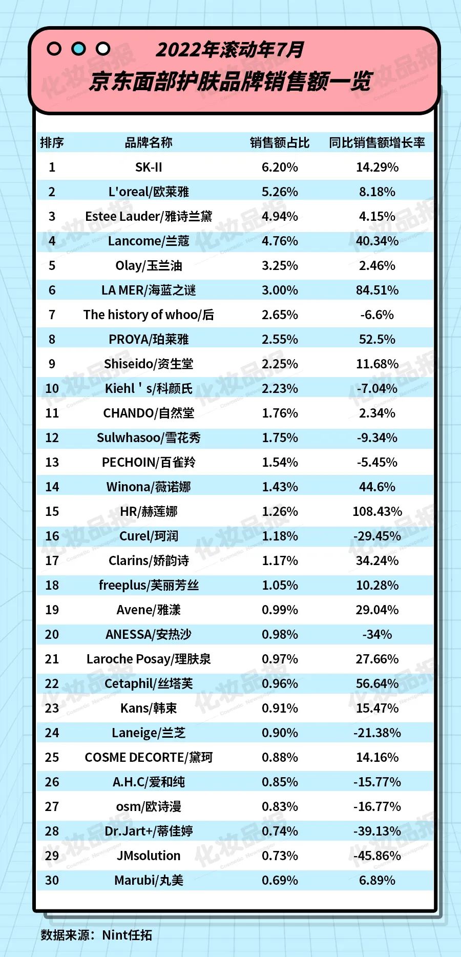 其中,面部護(hù)膚銷售額為306.15億元,同比增長7.58%。京東美妝護(hù)膚TOP30中,SK-II的銷售額為18.98億元,位列榜首,巴黎歐萊雅以16.1億元的銷售額次之,國貨品牌珀萊雅入圍TOP10,以7.81億元的銷售額位列第八名。與在淘系平臺(tái)的“慘烈下滑”不同,外資品牌在京東平臺(tái)表現(xiàn)亮眼,超過60%的品牌銷售額取得了增長。如歐萊雅集團(tuán)旗下主打玻色因護(hù)膚的高端品牌赫蓮娜,銷售額同比增長108.43%至3.86億元。除SK-II和巴黎歐萊雅外,TOP5中的蘭蔻、玉蘭油和海藍(lán)之謎的銷售額均取得增長。