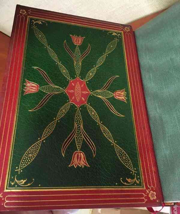 3.裝飾襯里環(huán)襯。在18世紀(jì)中期以前,裝飾襯里環(huán)襯很少會被用及,相較英國書籍,在法國書籍上更常見此類環(huán)襯。這種環(huán)襯之所以會被裝幀師強(qiáng)調(diào),是因?yàn)樗鼈儾⒉皇羌?,而是皮革,且通常是裝飾精美的皮革。技術(shù)層面上講,只有皮革襯里才會這么稱呼,不過波紋綢襯里經(jīng)常也會被稱為裝飾襯里。波紋綢具有波浪形紋理,像是水紋。波紋綢是由軋光工藝或者編織來實(shí)現(xiàn)。綢緞襯里大多與摩洛哥山羊皮革結(jié)合運(yùn)用,在19世紀(jì)后半葉達(dá)到頂峰。它們增多了裝幀師的工作量,因?yàn)樾枰睗?、平熨、托裱后才能使用?/p>