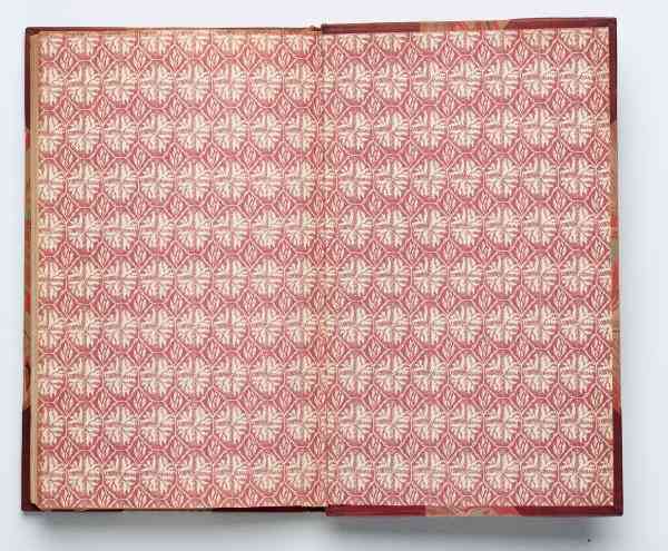 6.印花紙環(huán)襯。印花紙環(huán)襯在大約1880年開始使用。印花紙環(huán)襯圖案種類繁多,早期最常見的都是嬌小的重復(fù)性的裝飾圖案,顏色也很樸素,后期的設(shè)計(jì)包括花朵、鳥、葉子等圖案。有些更為精致的環(huán)襯會用金色和銅色印制圖案。裝幀師在選用后者的時(shí)候尤其要注意,因?yàn)橐恍┹^為廉價(jià)的材料,會在使用一段時(shí)間后變黑。印花紙環(huán)襯的出現(xiàn)得益于印刷技術(shù)的發(fā)展。彩色印刷在19世紀(jì)對歐美國家有較大影響,裝幀業(yè)在19世紀(jì)30年代開始機(jī)械化生產(chǎn),使大規(guī)模的裝幀成為可能。上文所提及的裝幀師使用的小型重復(fù)性圖案,系通過平面或凸版印制。在19世紀(jì)40、50年代,最初的裝飾紋飾是迷你幾何圖案,往往是由印刷廠的裝飾品構(gòu)成,圖案設(shè)計(jì)簡潔明了,用色明晰。