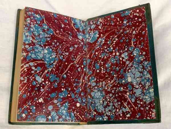 4.柯布紙環(huán)襯??虏技垼衷从谟旒垘烼homas Cobb,大約在1800年開始使用??虏技埵窃诩垵{中染色,質(zhì)地輕薄密實(shí),呈布紋,紙張潤濕時(shí)耐拉伸。制作柯布紙時(shí),可以染制各種顏色,不過暗紅褐色和橄欖色較為常見。19世紀(jì)早期,柯布紙用于書籍封面,尤其見于小牛皮半皮面拼接裝幀;19世紀(jì)下半葉,柯布紙主要用作稍平價(jià)的皮革裝幀的環(huán)襯。