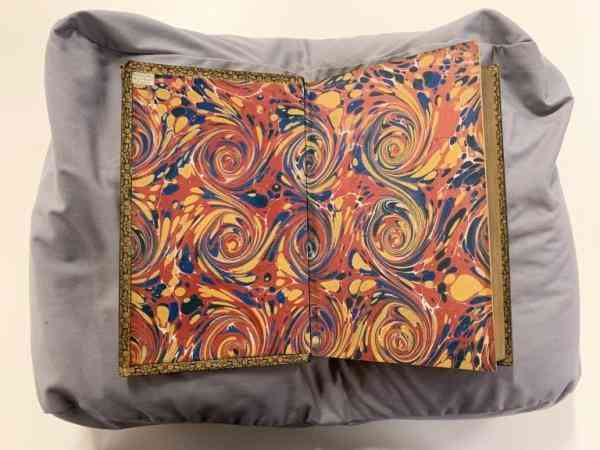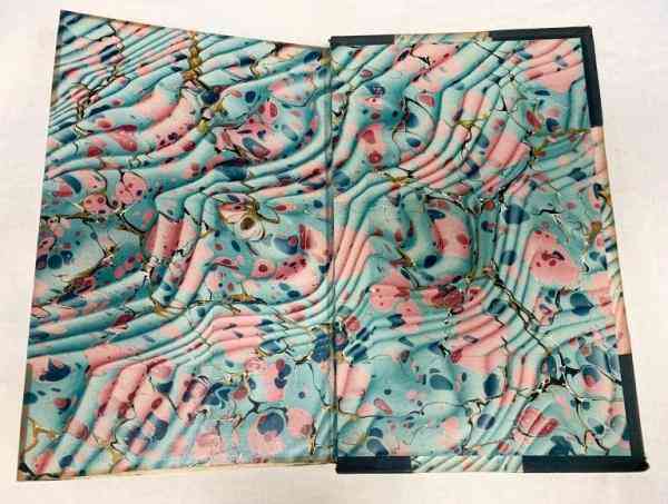 7.大理石紋紙環(huán)襯。大理石紋染紙(marbling),仿大理石紋,歷史悠久,是利用懸浮的顏料染紙的方法。有些染制紋飾是仿制大理石紋路,故而名之,亦有稱流沙箋、水拓畫、濕拓畫等。有觀點(diǎn)認(rèn)為最早的裝飾性環(huán)襯為大理石紋環(huán)襯,之前的環(huán)襯都是白紙或者羊皮紙。