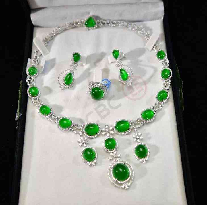 18k白金鑲翡翠配鉆石項(xiàng)鏈、戒指、耳環(huán)套裝(S-47-91)
