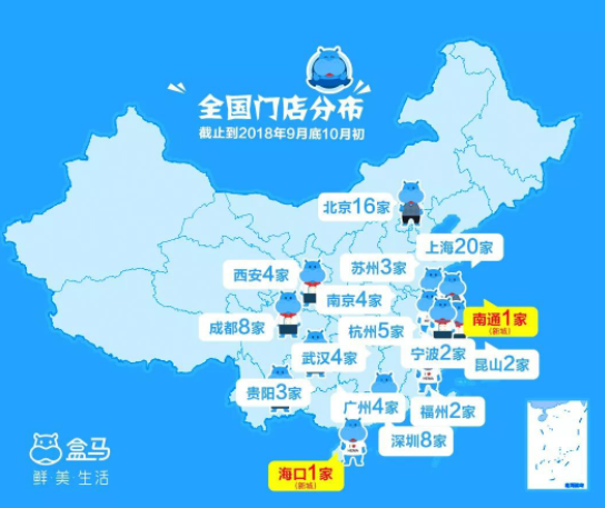 9月底、10月初,盒馬鮮生將迎來全國13城共20店開業(yè),分布在海口、南通、北京、成都、廣州、貴陽、杭州、南京、上海、深圳、昆山、武漢、西安,其中??诤湍贤楸敬螖U店新進(jìn)駐的城市,廣州、成都、南京、武漢、福州、西安以及昆山則是上半年新開拓的市場。至10月初,盒馬鮮生在全國的門店將達(dá)到87家。