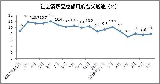 9月26日,中國商業(yè)聯(lián)合會 、中華全國商業(yè)信息中心公布了2018年1-8月份消費品市場運行情況。數(shù)據(jù)顯示,2018年1-8月份社會消費品零售總額實現(xiàn)242294億元,累計增長9.3%,增速較2017年同期放緩1.1個百分點。其中,8月份社會消費品零售總額實現(xiàn)31542億元,同比增長9%,增速較上年同期回落1.1個百分點,較上月有所回暖0.2個百分點。