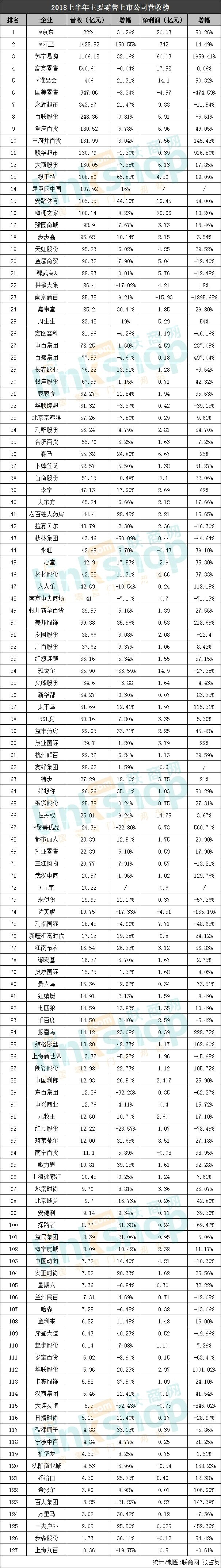◆2018上半年零售上市公司營收排行榜