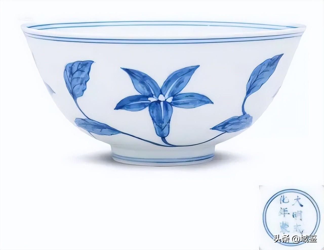 左 明成化青花內(nèi)梵文海石榴紋臥足碗 2011年北京保利5117.5萬(wàn)元成交