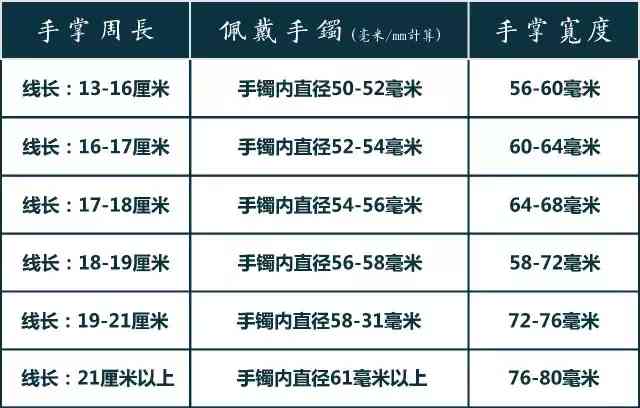 測(cè)量出來的數(shù)據(jù)換算一下,參照下表就能知道戴多大的手鐲了~